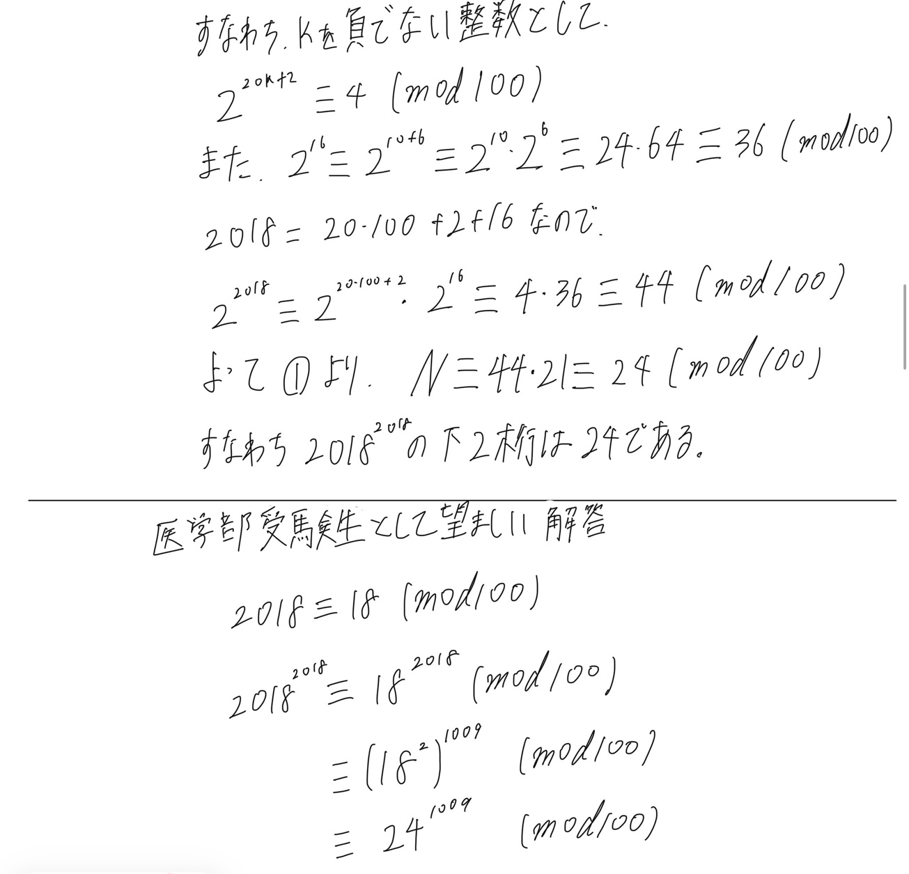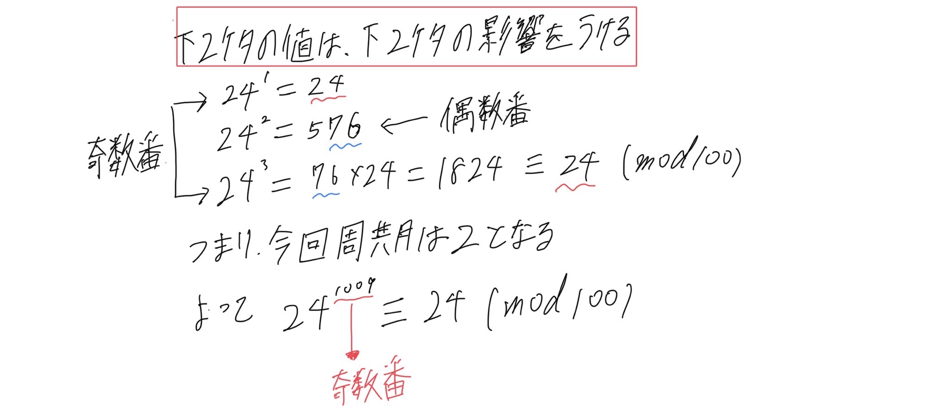 この問題でいえば、下2桁はmod100を利用することにより、周期の問題に置き換えられます。